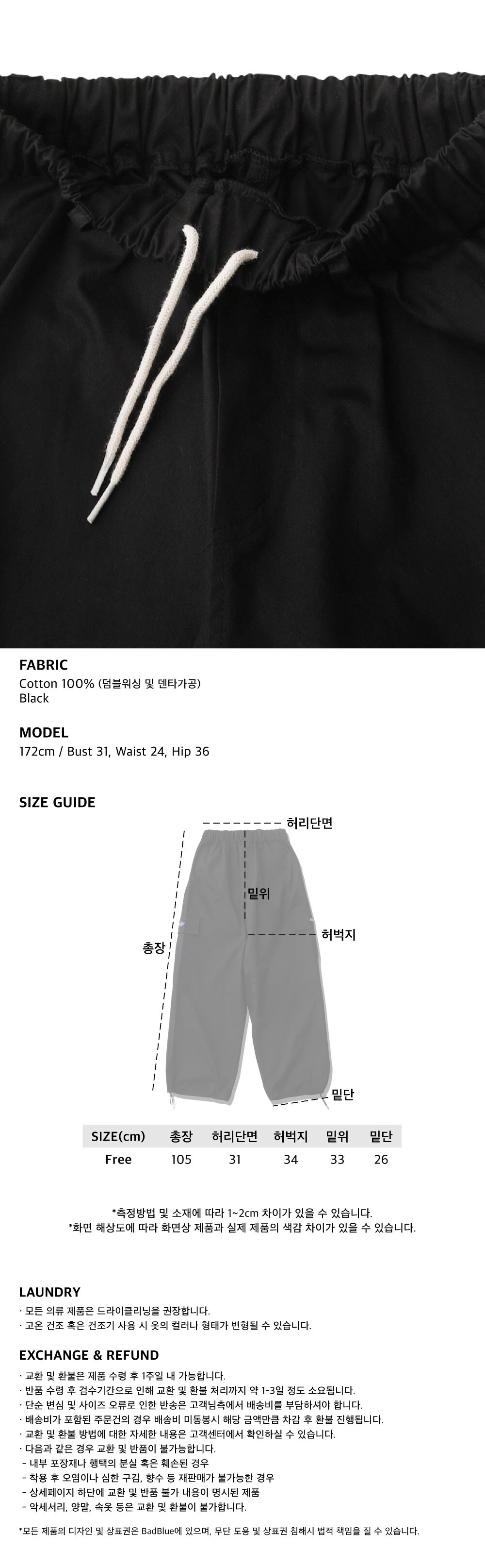 총장 105cm 허리단면 31cm 허벅지 34cm 밑위 33cm 밑단 26cm