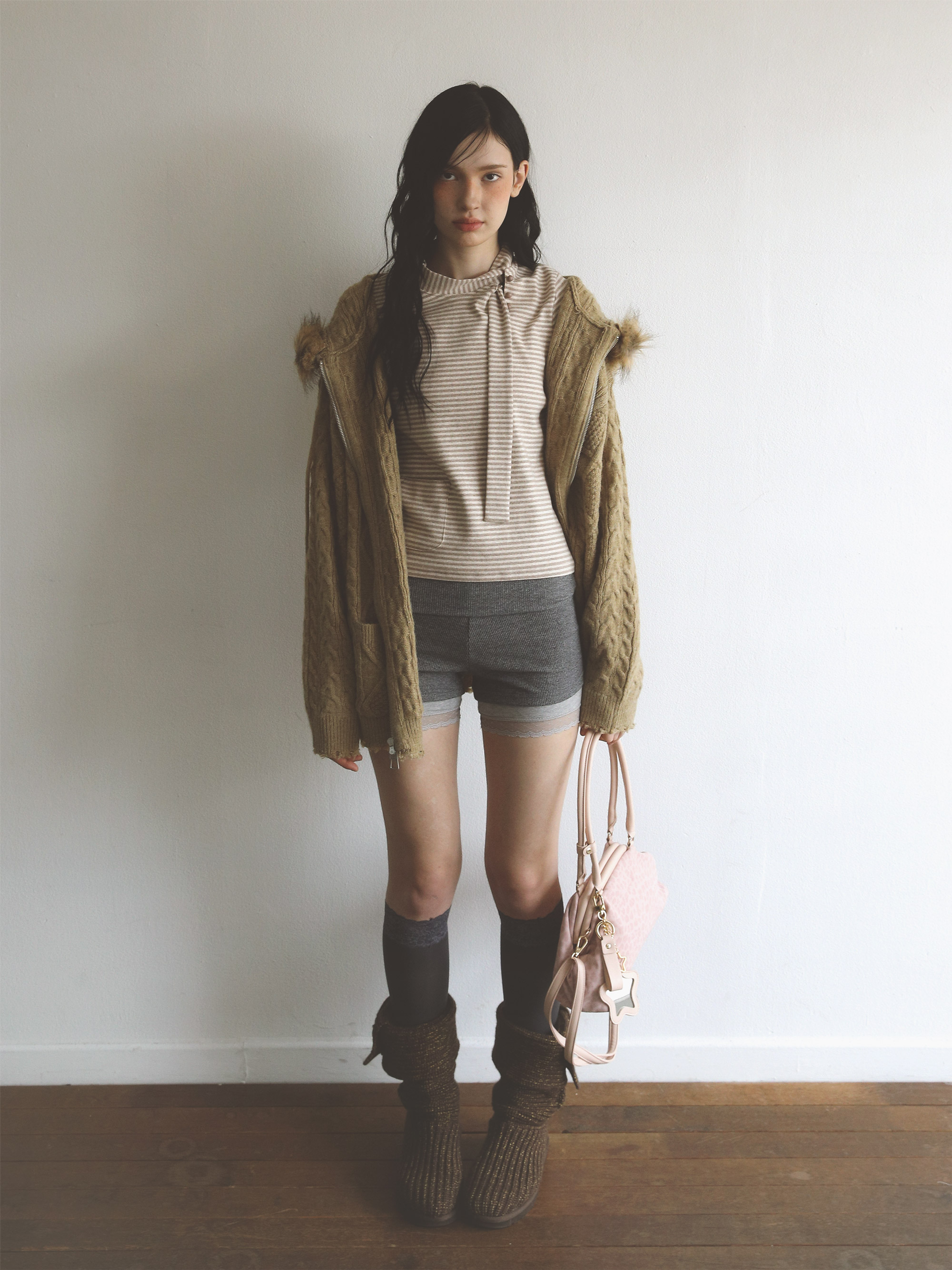 Removable Shearling Knit Hoodie Zip Beige